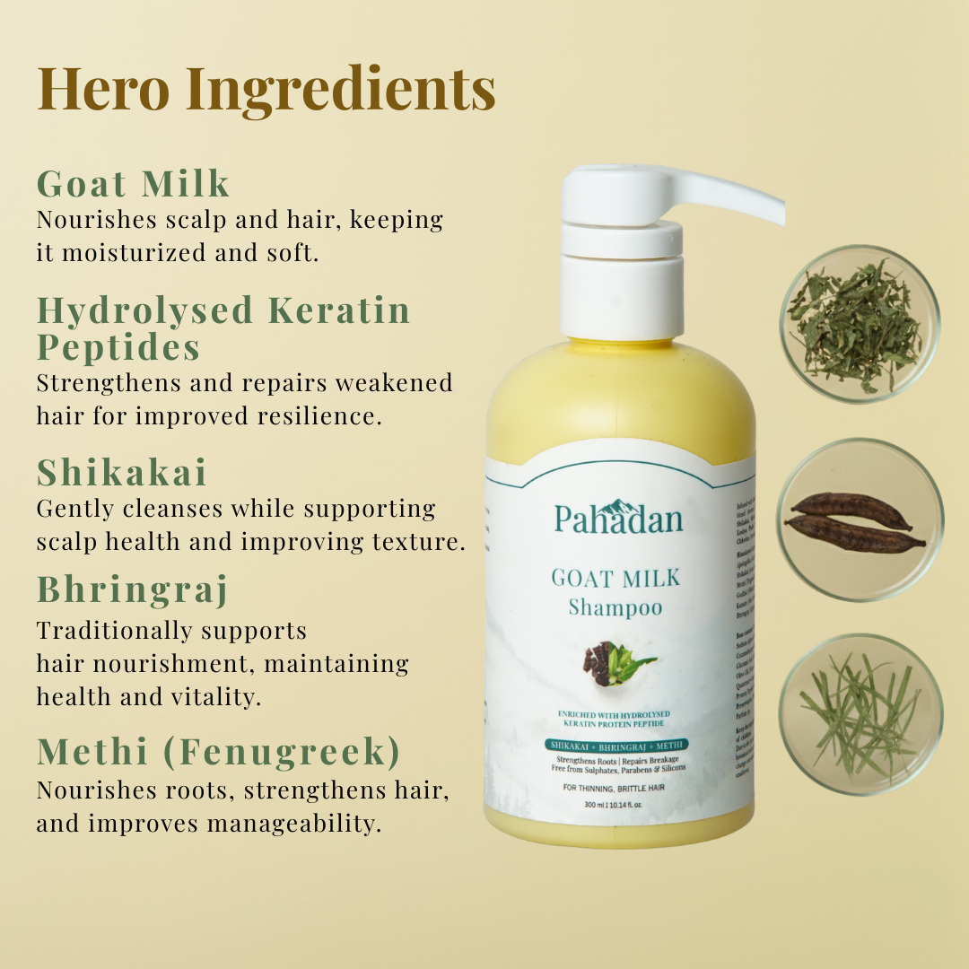 A gentle Ayurvedic goat milk shampoo enriched with Hydrolysed Keratin Protein Peptides, Shikakai, Bhringraj, and Methi to strengthen roots, repair breakage, and cleanse hair without stripping natural oils.