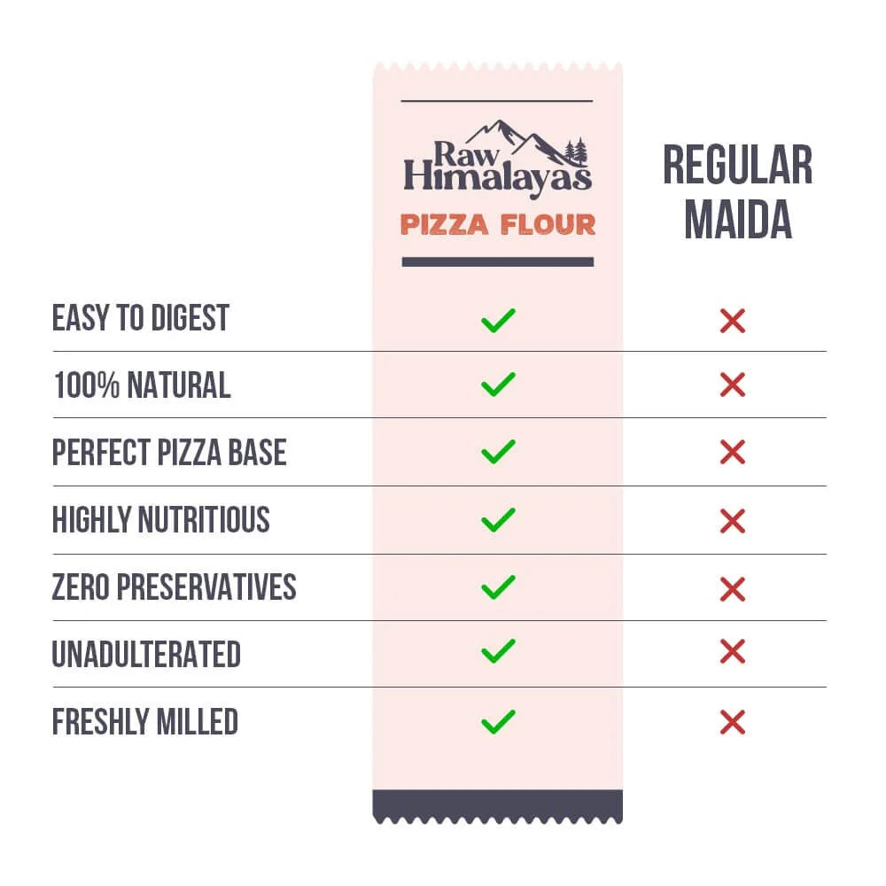 Raw Himalayas Himalayan Pizza Flour is the perfect flour to enable you to bake every type of pizza because it is milled finely to achieve the ideal texture, and with 12.49% of protein content, you can be certain of a strong gluten network.