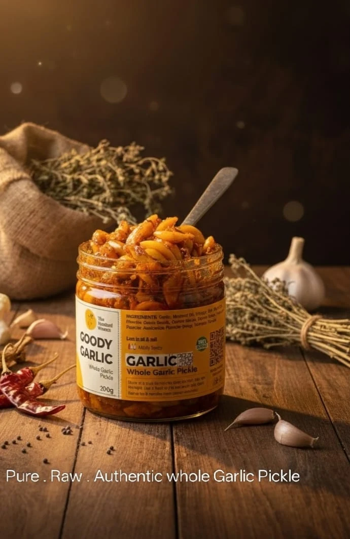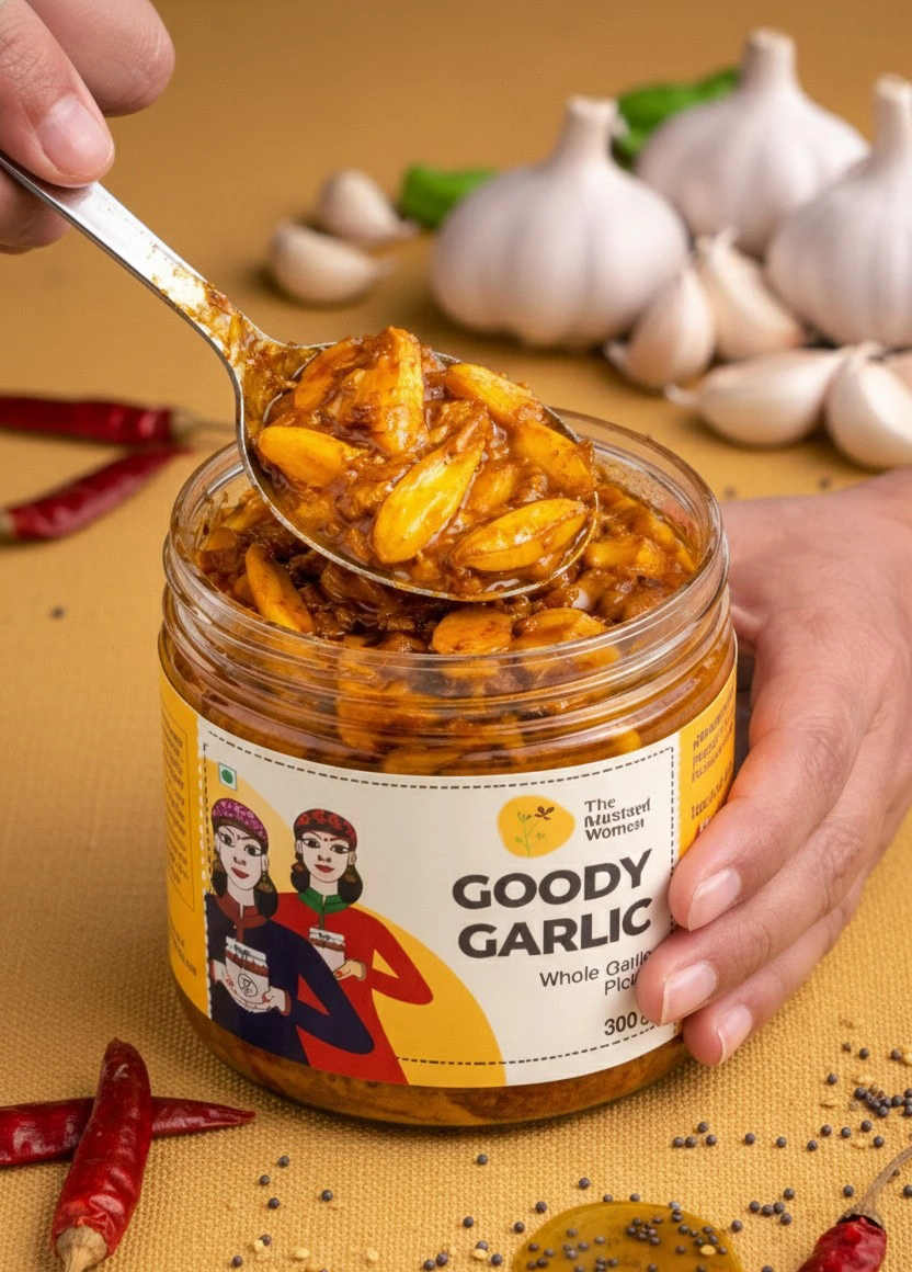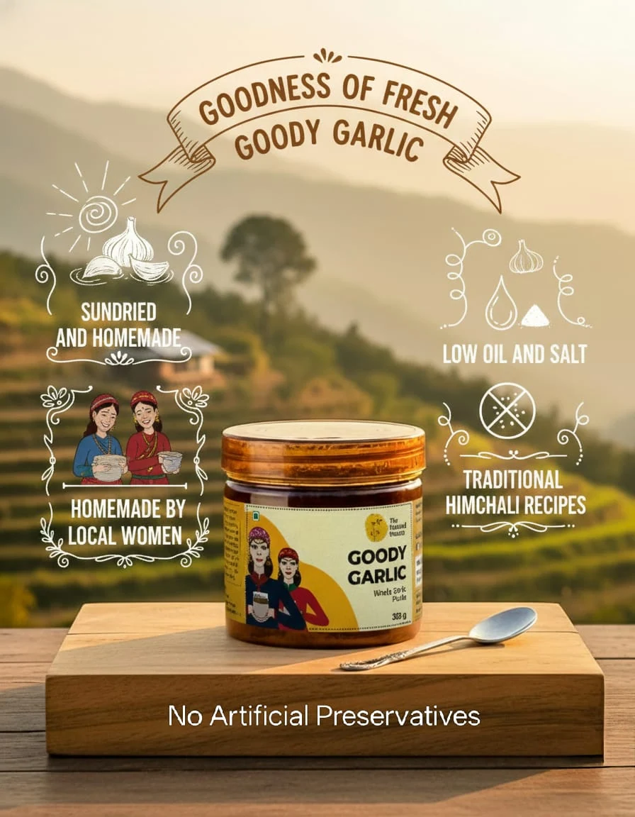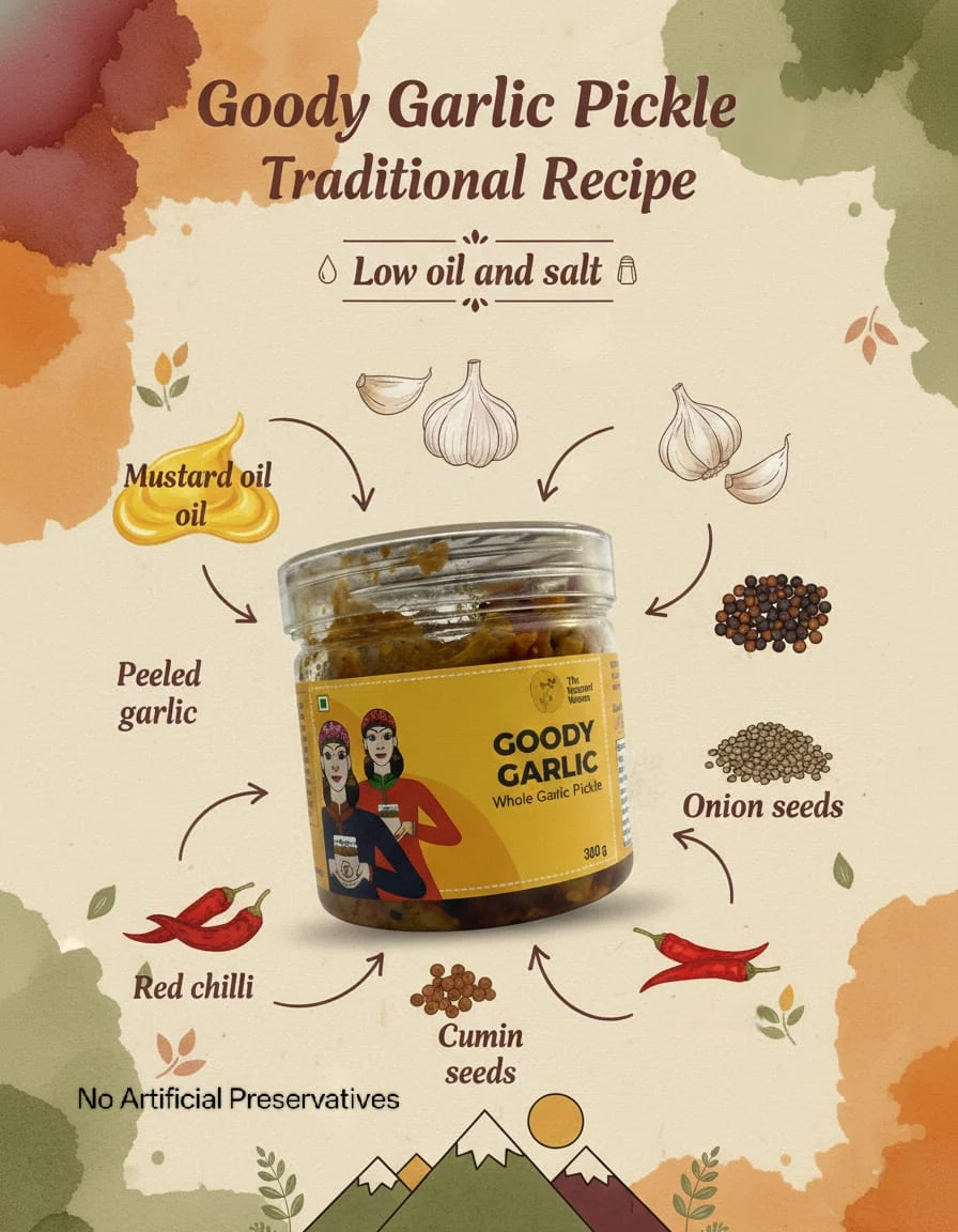 Flavorful Himachali Garlic Pickle – Made in the traditional Himachali style, this pickle captures the full goodness of whole garlic – preserving the rich aroma and comforting tastes of fresh garlic and mountain air. A taste like no other – it pairs best with parathas and your daily meals.