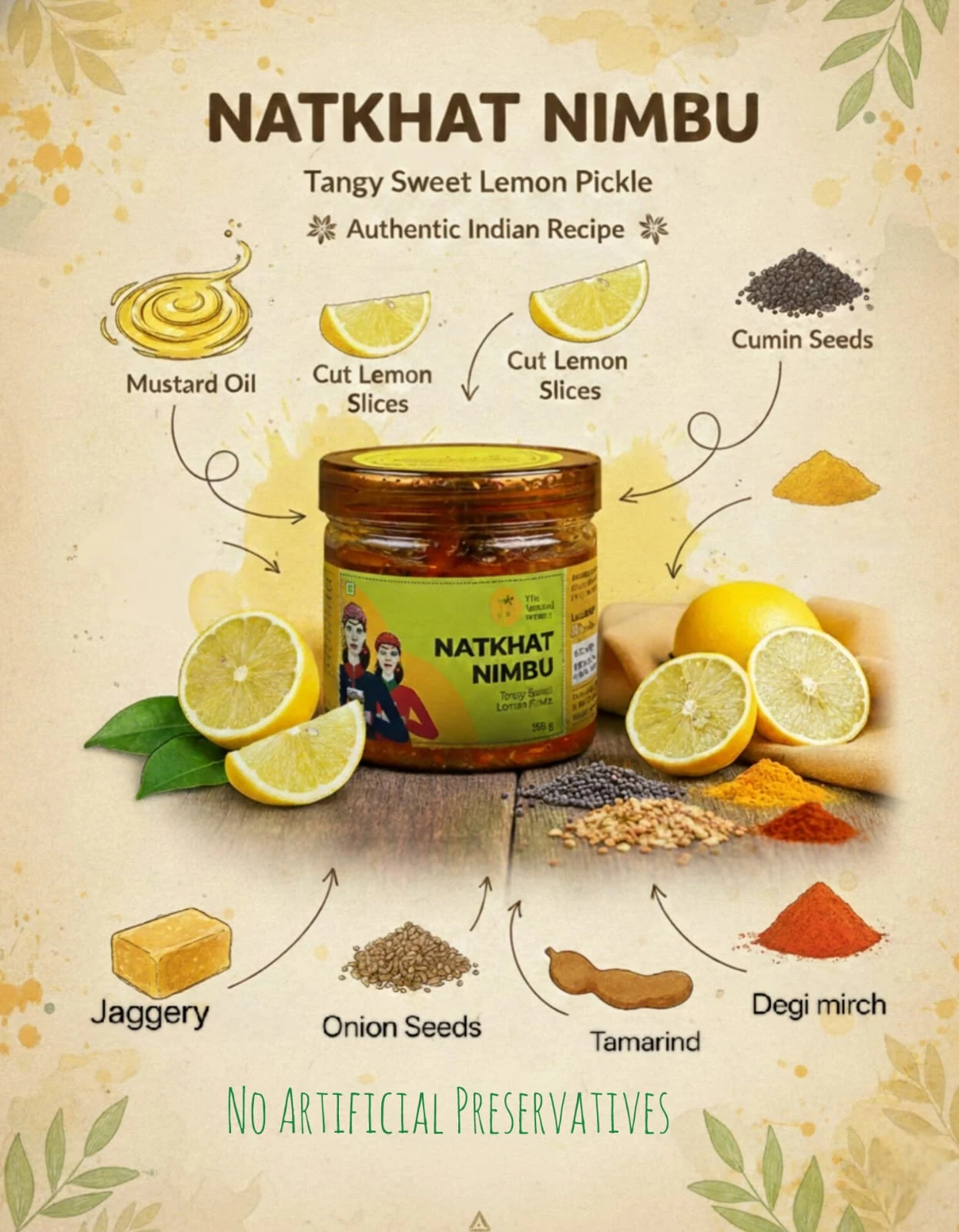 Ingredients: Lemon , jaggery, ajwain ,fennel seeds ,coriander powder , kashmiri chilli powder , Nigella ( Kalonji ), Fenugreek , Mustard oil , Salt , Vinegar